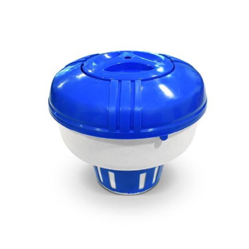 Boya dosificadora de cloro para pastillas de 50 y 200 grs, con hojal para limitar su movilidad dentro del espejo de agua. De construcción robusta, permite regular el intercambio de cloro mediante un regulador.