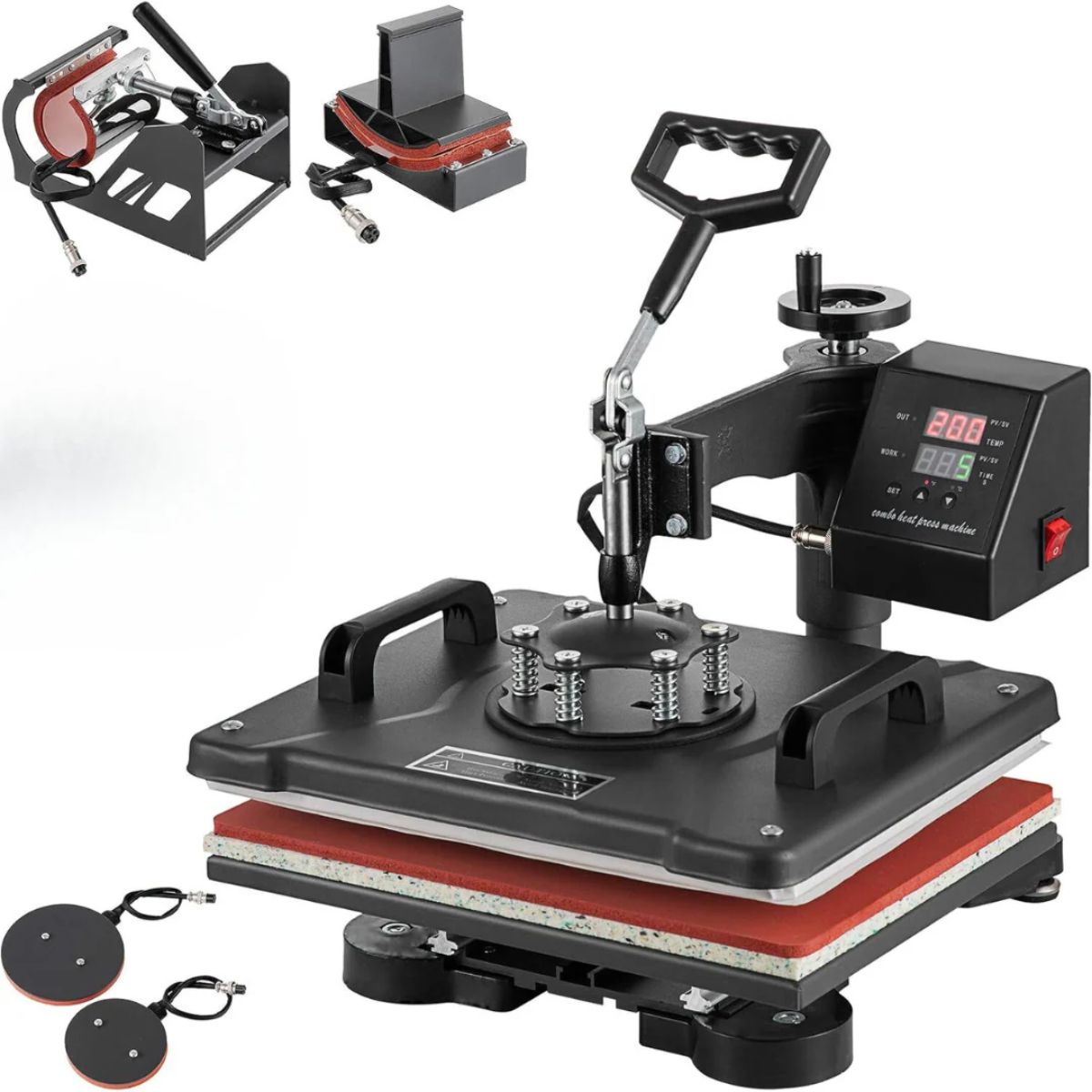 Multifuncionalidad 5 en 1: Incluye accesorios intercambiables para sublimar camisetas, gorras, tazas, platos, cubriendo todas tus necesidades de personalización en un solo equipo.